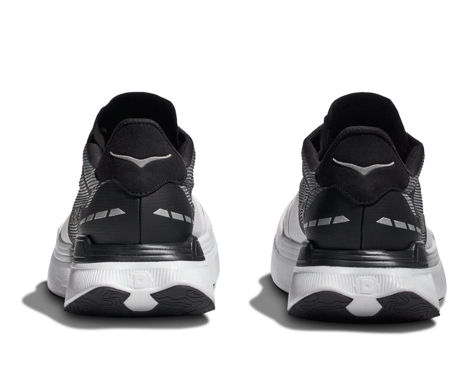 Moving down, it’s hard toΒ miss the responsive, super-critical midsole foam underfoot. Super-critical meaning this midsole foam has been injected with a combination of gases to create an incredibly lightweight and cushioned experience. This midsole is slightly firmer than the traditional Clifton or Bondi but feels much more lightweight and responsive. Incorporated into the midsole is a forked carbon-fiber plate, helping maximize energy return and provide a propulsive feeling ride. This plate is certainly noticeable when walking, letting you take one energized step after another, but also noticeable when picking up the pace on runs.Β