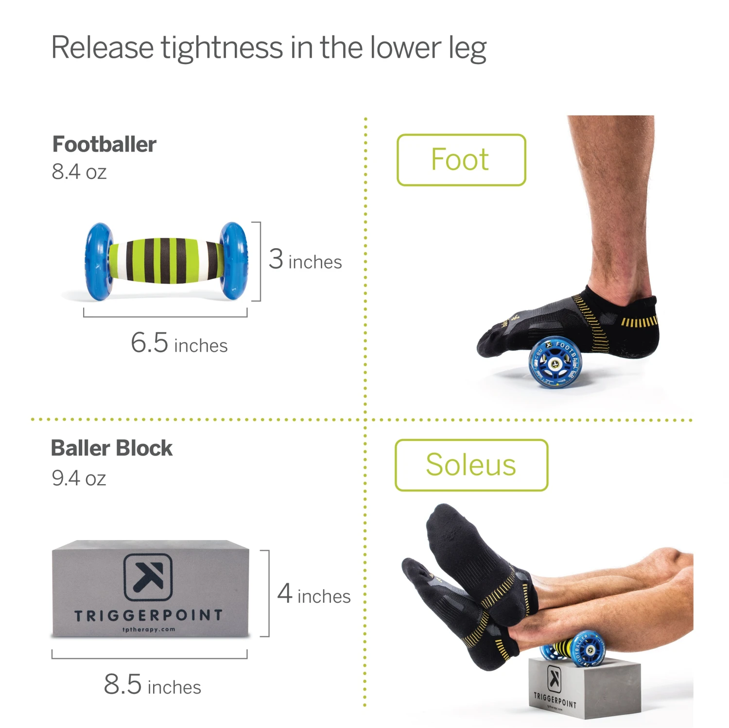 - Baller Block: Provides elevation for optimal range of motion and application of pressure when using TriggerPoint products. Also, reduces space and houses the Footballer when not in use.